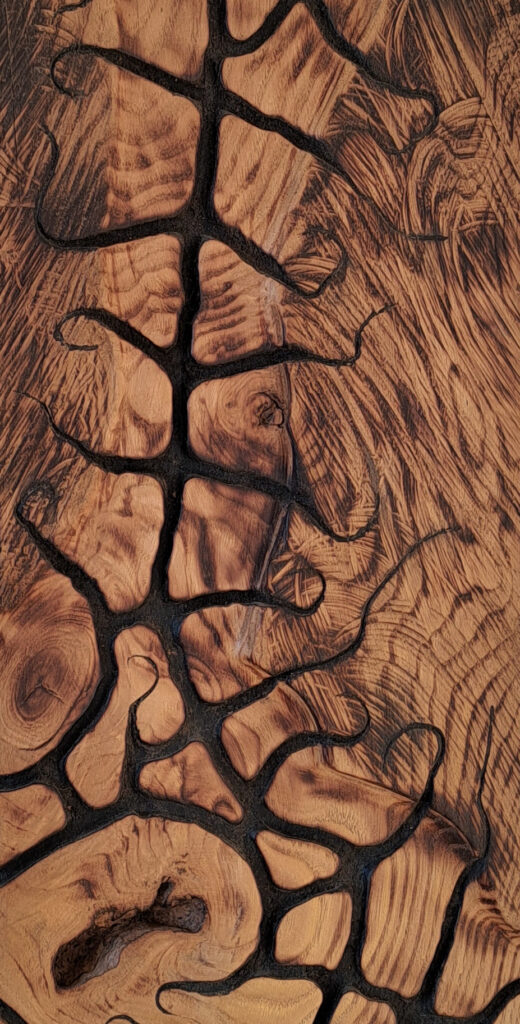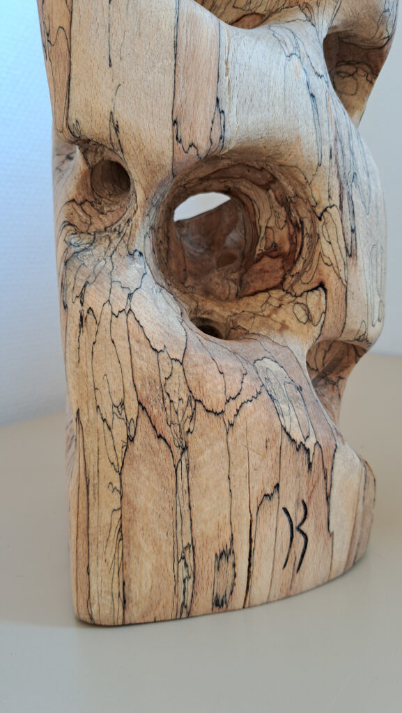 Ses sculptures sont percées de toutes parts avec parfois des pièces suspendues ou avec des lignes comme des veines ou des failles.