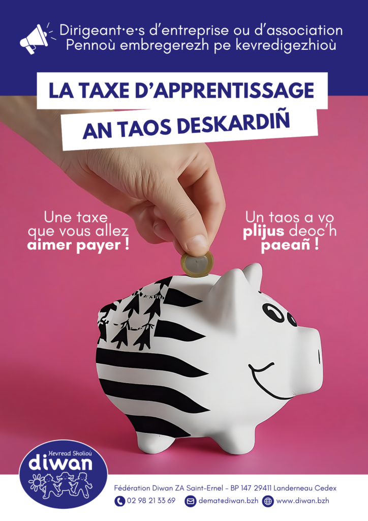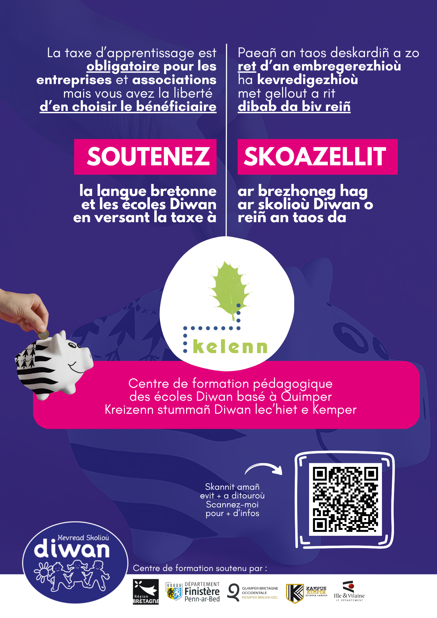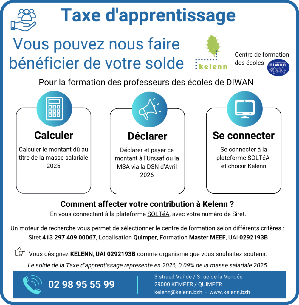 Le centre de formation Kelenn, en charge des formations du personnel enseignant du réseau Diwan est habilité à recevoir la taxe d’apprentissage pour le Master MEEF-EBI, c’est à dire la formation qui prépare les futurs professeurs des écoles Diwan.